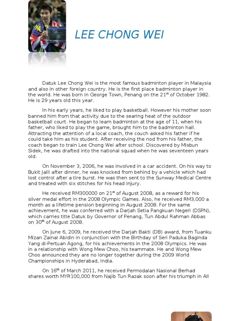 Lee was born in bagan serai, perak,into a malaysian chinese family, to lee ah chai and khor kim choi. Lee chong wei was born on 21 october 1982 in bagan serai, perak. Flip html5 is a interactive html5 digital publishing platform that makes it easy to create . Lee chong wei adalah pemain bulu tangkis profesional tunggal putra dari malaysia. Darüber hinaus schrieb lee eine ausgezeichnete biografie mit dem titel „dare to be a champion", .